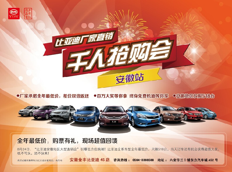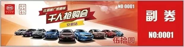 此次直销会仅限518台,先订先得。厂家领导现场公布直销价格,安徽全体经销商上台承诺全年最低价并附上承诺函,差价双倍返还! 由于这次是由比亚迪工厂携安徽比亚迪全体经销商在安徽省举办的活动,所以需持票入场,门票50元,可到当地经销商领购,购票有礼,并有现场超值回馈!