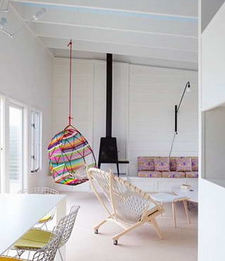 除了卧室以外,房间几乎已全部被打通,使得各个空间之间有呼应和交流。吊椅的颜色介于客厅和就餐区两个色系之间的,巧妙地将两个空间的色彩连接起来。
