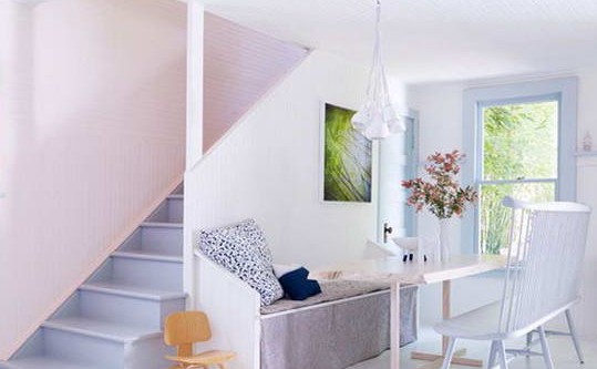 楼梯旁的空间,被巧妙地利用起来作为早餐空间。正对大窗的位置可以感受到阳光倾泻进整个房间;纯净的白色墙面,在阳光下显得清透明亮。