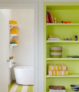 卫浴间中大量采用绿色的墙漆材料,让整个空间充满活力。装修第一网提醒业主,清新的色调,明亮的空间带来个性化的视觉焦点。椭圆形的白色浴缸宽敞舒适,设计简洁但很实用。