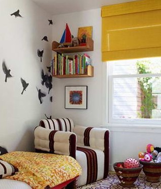 素色的墙面因自由排列的飞鸟而形成动感的视觉效果,与卧室里鲜亮的家具等搭配,显得精彩十足,不仅增添了房间的趣味性,也让卧室整个雀跃起来。
