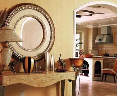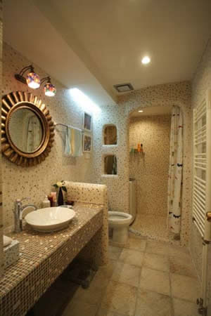 马赛克镶嵌、拼贴在地中海风格中算较为华丽的装饰。主要利用小石子、瓷砖、贝类、玻璃片、玻璃珠等材质,切割后再进行创意组合。