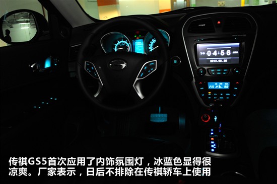 GS5首次采用了氛围灯设计,冰蓝色的灯光给人以凉爽感,并在一定程度上起到了烘托车内气氛的作用。厂家表示,日后不排除在传祺轿车上使用该功能,当然这个要看消费者反馈情况而定。