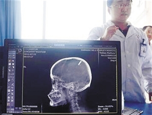 很快,于洪被父亲送到附近的一家医院,当时他满脸是血,说话都吃力。X光片显示,钥匙深入于洪头部2厘米左右,穿透颅骨、深入脑部,钥匙露在头皮外面的部分3厘米左右。医生在于洪头部开了11厘米的切口,用磨钻、夹钳等器械打开颅骨,并取下了直径约1厘米的小块,3小时结束手术。据悉,当事两人已和解。