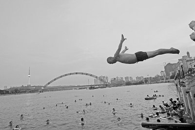 汉江边市民跳水。 记者王翮 摄