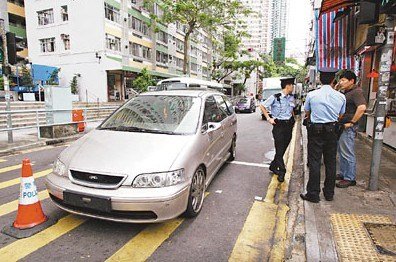 怀疑被偷车贼盗取并疯狂驾驶的7人车在香港大厦街被截获,当时车头的车牌已被拆去。