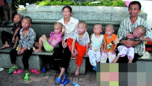 谭万兴和罗思亲带着7名子女在重庆一广场乞讨。 信息时报讯 对于普通家庭来说,一对双胞胎或三胞胎的降临是全家人的大喜事。但是,如果连生两对双胞胎、再来三胞胎,会让人有怎样的感受?