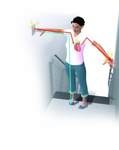 一手摸到裸露电线,一手搭上扶手,电流经过心脏