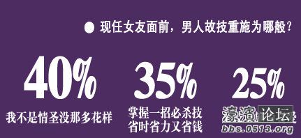 40%的男人坦言自己的恋爱手法并不高明,也没有过多的精力潜心研究,既然不具备推陈出新的实力,也只好故技重施了。虽是无奈之举,却也的确是多数男人的心声。