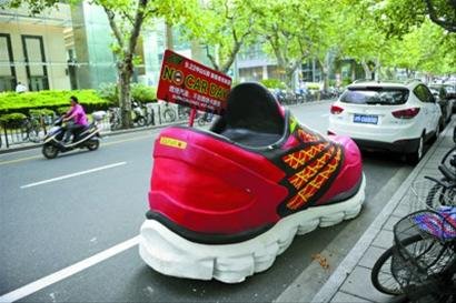 新闻晚报讯 日前,在襄阳南路淮海中路口,一只堪比越野车大小的巨型“运动鞋”堂而皇之地“停”在了收费停车位上。