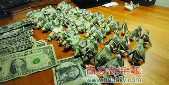 照片显示,一张办公桌上的两个盒子里摆满了绿色的折纸,仔细一瞧,都是印有华盛顿头像的一美元纸币做的,而且据说是一名当地男子因为不满交警处罚折了这些钱交罚款的。