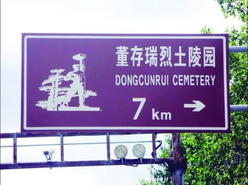 读者反映的指示牌在隆化县汤头沟镇北出口路雕塑公园附近,长约两米,高约一米,“董存瑞烈土陵园”7个大字格外醒目,其下是英文,向右有一个箭头,标注为7公里。