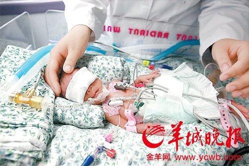 羊城晚报记者看到躺在温箱里的她,周身粉红,小手握起来还不及一枚一元硬币大;她的四周围满了维生设备, 胸前贴着各种监护装置的探头,连呼吸都需要呼吸机维持着。