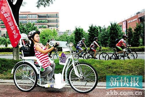 昨天中午,广州大学城外环路绿道上缓缓地出现了一片黑压压的人群,领头的姑娘,名叫邓春晴,她正“摇着”特制自行车艰难前行,额头上豆大的汗珠不停滑落。这是出现在2012环大学城自行车耐力赛中的一幕,这个特殊参赛者,是一名下肢瘫痪的残疾人。