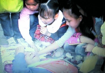 昨天,记者在张成欣拍的DV上看到,鲜血浸透了纸巾,几名小学生便接力从书包中取出纸巾,继续将老人的伤口捂了起来。大约10分钟后,老人想坐起来,被几名小学生制止住,他们劝他:“莫动,伤口还在流血。”