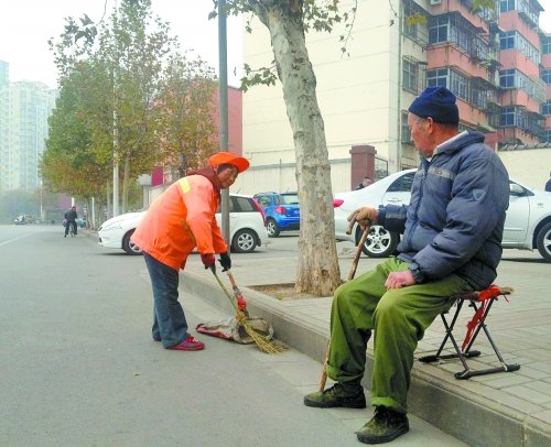 60岁女环卫工带着80岁残疾老伴上班5年(图)