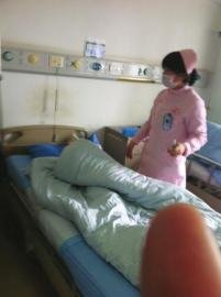 护士给亮亮打针,亮亮使劲地用被子把自己裹起来。