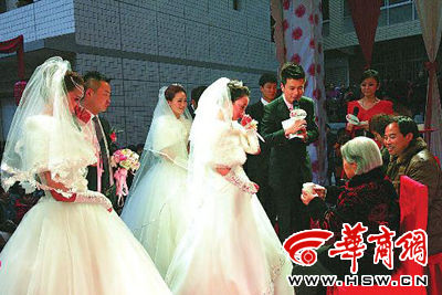 昨日下午4时,婚礼的现场被围得水泄不通,数百名看热闹的市民站满了院子,院子两边的人家都打开了窗户观看。婚礼台上,三位新郎手挽三位新娘满目含笑,向来宾致敬。一时间,3对新人谁大谁小让亲朋好友猜来猜去分不清。