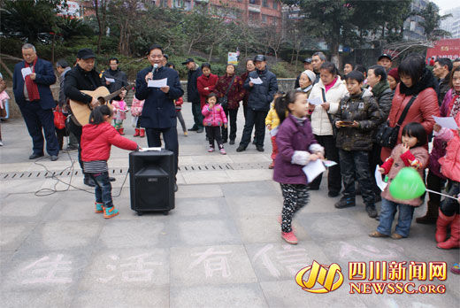 12月15日上午10时许,四川达州主城区中心广场突然传来了一阵山歌声,引得不少市民围观,路过此地的记者也被吸引过去。只见一名40多岁的男子在此演出,他面前的地板上用粉笔写着两行大字:要对生活有信心,不要相信末日论。细听其歌词,唱的是“十八大精神暖人心,咱们的生活更太平,一天更比一天好啊,不要相信末日论....。.”他声音洪亮,音色圆润却跌宕起伏,起承转合技艺娴熟,围观者无不鼓掌称赞。