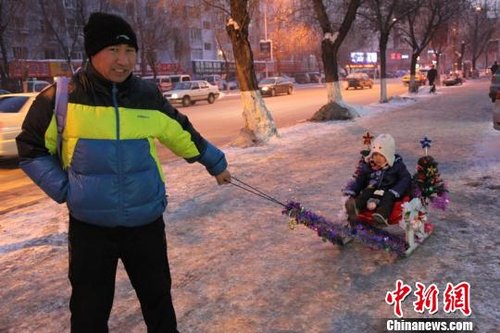 12月17日下午16时许,吉林市一名男子在雪地上拉着一个自制的“圣诞雪橇”,接在幼儿园放学的儿子回家。途经街路,引得路人纷纷侧目。