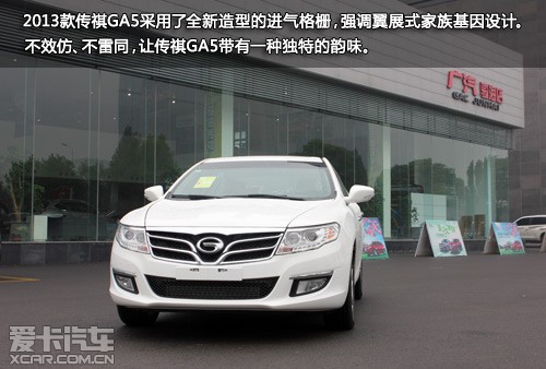 外观方面,2013款传祺GA5采用了全新造型的进气格栅,强调翼展式家族基因设计。不效仿、不雷同,让传祺GA5带有一种独特的韵味。同时由于开发平台源自阿尔法166,让传祺不论外观还是操控性又带有明显的欧洲血统。