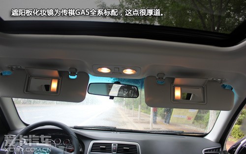 遮阳板化妆镜为传祺GA5全系标配,这点很厚道。而除了自动舒适版之外,其他车型均配备了电动天窗。