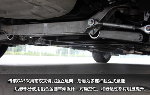 传祺GA5采用前双叉臂式独立悬架,后悬为多连杆独立式悬挂,后悬部分使用铝合金副车架设计,对操控性、和舒适性都有明显提升。