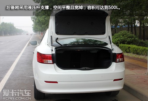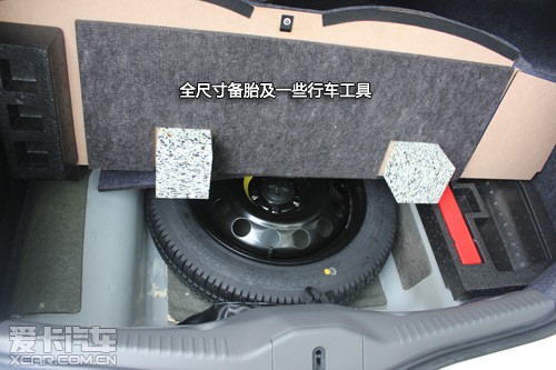 后备厢采用液压杆支撑,空间平整且宽绰,容积可达到500L,足以应付日常需求。掀开后备厢地板,可看到全尺寸备胎及一些行车工具。