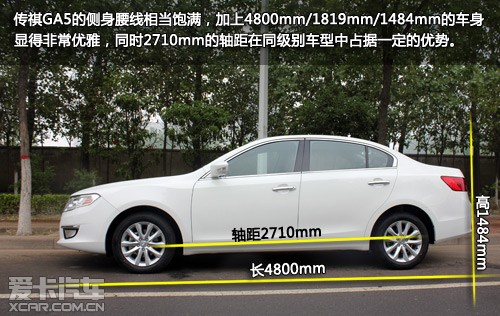 传祺GA5的侧身腰线相当饱满,加上4800mm/1819mm/1484mm的车身尺寸,让GA5显得非常优雅,同时2710mm的轴距让GA5在同级别车型中占据一定的优势。