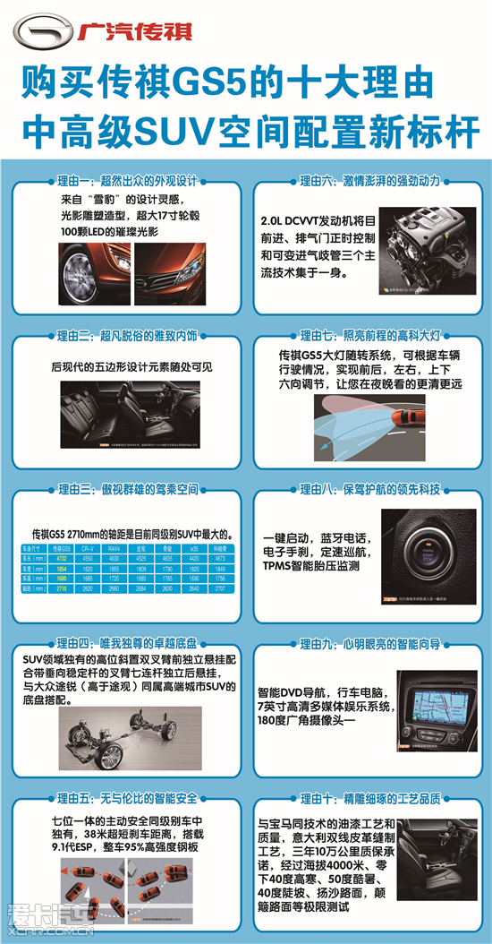 传祺GS5自2012年4月份上市以来备受消费者的青睐,月销量突破5000辆大关,2012年一举斩获多项大奖,如果你还在犹豫举棋不定的话,我们将给您搜罗了购买传祺GS5的十大理由,让您明明白白轻轻松松拥有世界级的舒享座驾。