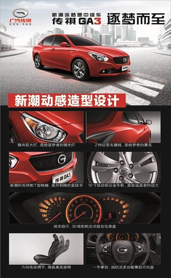 传祺GA3传承家族优良操控基因,采用同级罕有的前麦弗逊+后多连杆四轮独立悬挂、EPS电动助力转向系统等高端配置,底盘经过广汽精心设计与保时捷工程公司的悉心调校,带来动感舒适的驾乘感受。