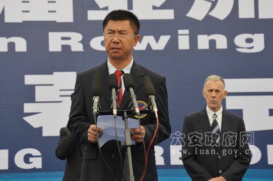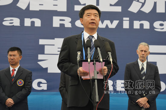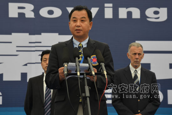 市委书记、市人大常委会主任孙云飞在开幕式上发表了热情洋溢的致辞,代表市委、市政府对各位领导嘉宾和运动员、教练员、裁判员表示最热烈的欢迎。孙云飞说,在举世闻名的淠史杭畔,六安传承着华夏文化的风采,传递着亚洲文明的雄风,这里有着悠久厚重的历史,有着精彩纷呈的山水,有着热情好客的人民,有着开拓创新的精神。自亚洲各地的赛艇健儿在这里激情挥桨,将是亚洲赛艇事业浓墨重彩的一笔,也是六安人民记忆醇美的篇章。孙云飞说,近年来,我市坚持脚踏红色土地,致力绿色发展,放飞金色梦想,古老的皖西大地正向着建设幸福六安的宏伟目标扬帆远航。作为东道主,我市将以精心的组织,周到的服务,用体育的桥梁来增进各国人民的友谊,用赛艇的划桨激荡奋进的浪花,努力把本届赛事办成一次成功、精彩、欢乐、难忘的盛会。