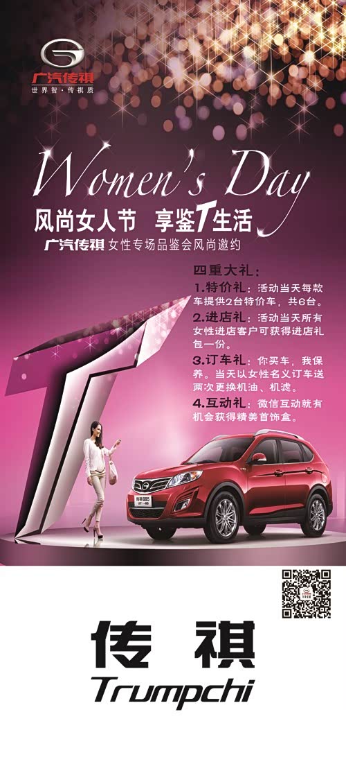 3月8日,广汽传祺情系三八妇女节,当日六安宝鑫4S店内将有神秘大促销活动,凡是当日到店女性客户均可获得精美女士礼品,意向客户均可到店赏车试车。