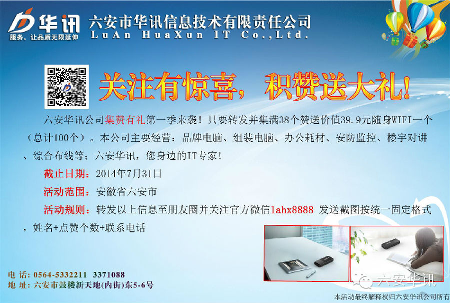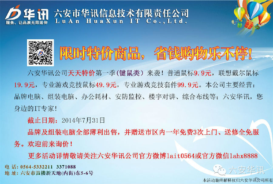 活动四:品牌及组装电脑全部薄利出售,并赠送市区内一年免费3次上门、送修全免服务。欢迎前来询价!