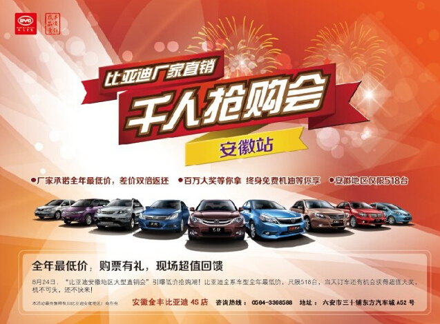 想有辆车接孩子放学?想买辆车去郊游?错过了车展?也错过了团购会?这都不是事儿。8月24日“安徽地区比亚迪厂家直销会”满足您的一切愿望。厂家全省直销,千人抢购,全年最低价!
