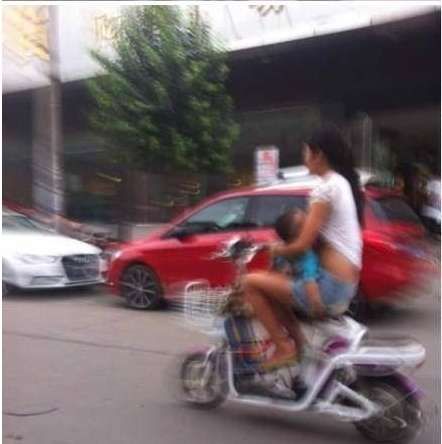 女子边骑摩托车边撩起衣服给孩子喂奶(图)