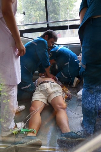 许先生说,此后车行至建设路桐柏路站时,两人仍在争执,公交车长出言予以制止,随后小伙子下了公交车,不过老人并未坐下,而是站在原处,情绪仍很激动。在车行至市中心医院站时,老人倒地,许先生发现后立即上前,并询问“你怎么了?”,老人没有回应,许先生立即通知了车长。