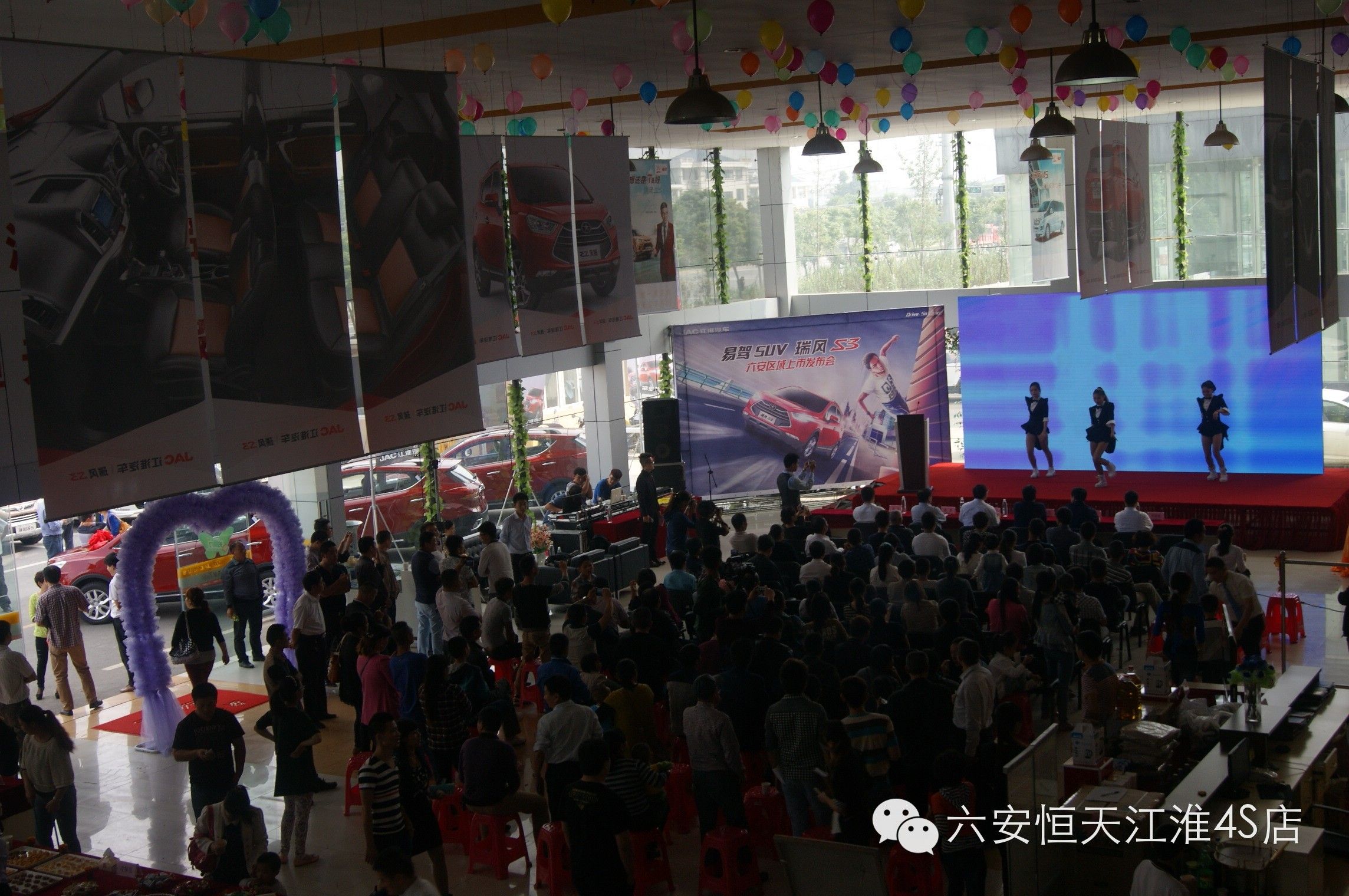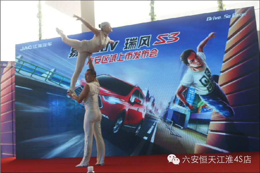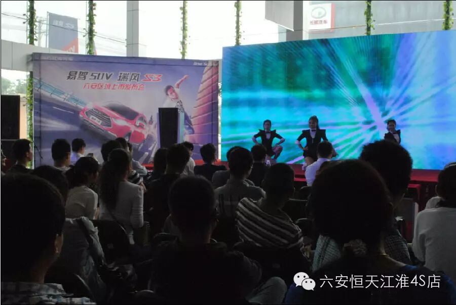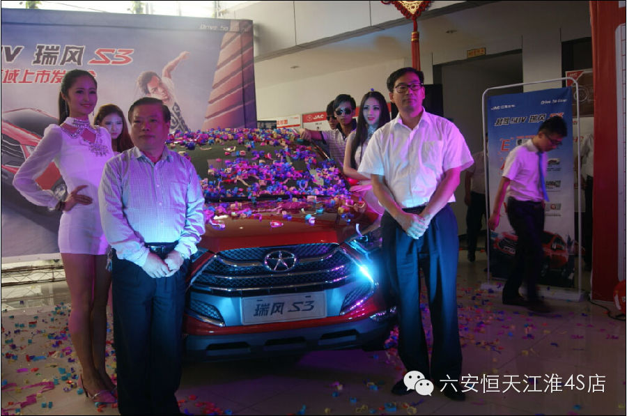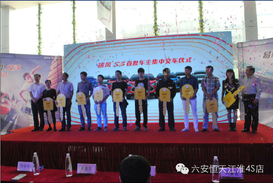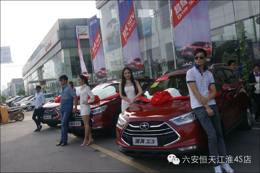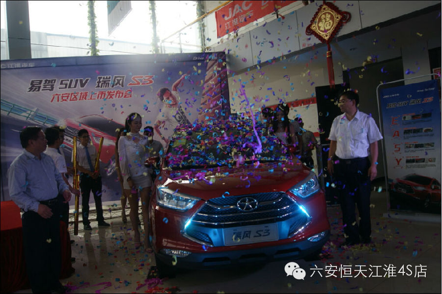 2014年09月20日,恒天江淮三周年暨易驾SUV瑞风S3六安区域上市会在六安恒天江淮4S店隆重举行。活动当天收获订单99台,引爆六安车市,活动现场邀请了大批的新老客户及六安地区主流汽车媒体前来一同见证“时尚、易驾、节能”的瑞风S3在六安区域的炫酷上市。凭借契合时下年轻人口味的“易驾”亮点以及低至6.58万至8.48万元的实惠价格,瑞风S3登场就赢得众多年轻消费者的“欢心”。