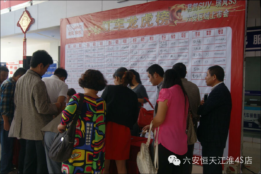 签到环节 六安恒天江淮4S店是江淮六安地区唯一指定授权经销商,深耕六安汽车市场数年,得到众多江淮车主的认可以及支持。当天发布会的人气则更好地印证了六安恒天江淮一直以来的服务质量与水平,为六安地区更多江淮车主提供更多快捷优质的服务。