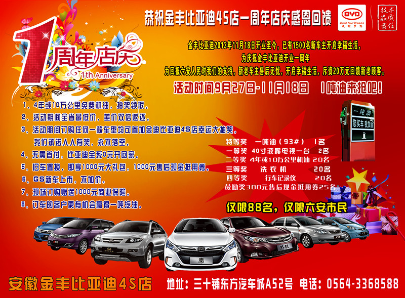 为回报六安人民对我们的支持,在六安金丰比亚迪开业一周年之际,六安金丰比亚迪斥资20万元回馈新老顾客新老车主,开启幸福生活,让您售后无忧!