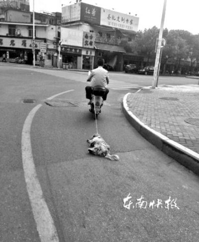 东快讯(记者陈腾健/文图片由受访者提供)“太过分了,居然骑着电动车拖狗!”昨天下午,网友“蔺可乐y”称,在福州市晋安区五里亭一带看到有一名老人虐狗,便用手机拍下照片并传到微博上。经过网络传播,老人的行为遭到众多网友指责。 网友“蔺可乐y”告诉东南快报记者,昨天下午三点左右,她正经过五里亭附近,突然看到前方有一位身穿蓝色衣服的老人骑着电动车。其电动车后方有一根绳子,绳子的另一头则系在一条黄色小狗的脖子上。这条小狗看起来奄奄一息,侧身躺在马路上任凭电动车拖动,没有任何反应。 网友“蔺可乐y”认为这位蓝衣老人是在虐待小狗,便上前找老人质问。老人告诉“蔺可乐y”,小狗不肯坐前面,要在后面跑,但“蔺可乐y”注意到,小狗的腹部血肉模糊。不久之后,蓝衣老人便骑着电动车离开。 昨日,东南快报记者试图联系该老人,但未联系上。 这条微博一经发布,老人的行为便遭到众多网友的指责。网友“罗源通”表示不解:为什么如此对待狗狗,它怎么你了? 还有一些激进的网友对老人进行了人身攻击,并表示要在五里亭一带蹲点,找老人要个说法。 福州小动物保护中心负责人梁女士表示,这说明大多数人对小动物有爱心,但人肉、人身攻击等做法并不可取。不过这也从另外一方面说明,我国的动物保护条例还不健全,人们只能从道德的层面进行批判和谴责,而不能从法律的层面进行约束。