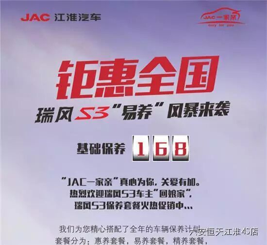 瑞风S3“易养”风暴即将来袭,六安恒天江淮4S店真诚为您的爱车呵护到底,欢迎您带瑞风S3“回娘家”,专属瑞风S3的保养套餐,养车实惠一站到位。