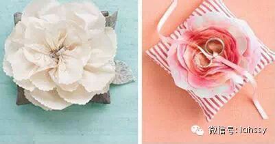 将戒指系于花朵之上也是深受新人青睐的方式之一,可以DIY大朵的绢质鲜花或者在布艺基础上装饰鲜花花材。