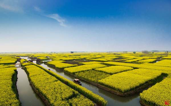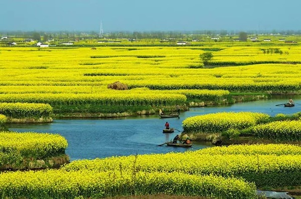 每年清明前后,在辽阔的水面上,千姿百态的垛田形成了上千个湖中小岛,岛上开满金灿灿的油菜花,在水面上形成一片金黄色“花海”,一望无际,令人叹为观止。