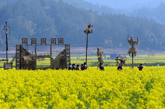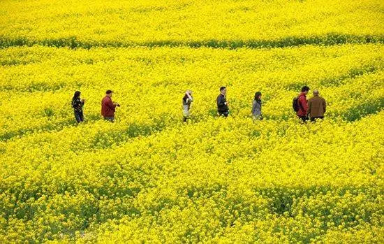 南京高淳 慢城恢弘的油菜花  高淳位于南京市周边,南京的地理位置更靠近北方,气温相对安徽石潭和江西婺源要低,因为花开的也比较晚。整个油菜花节持续一个多月时间,按照预计,在清明节期间,油菜花依然处在观赏期内。    其中70亩的庄稼画——“菜花螃蟹”一直是高淳油菜花的亮点。高淳油菜花节较为年轻,但与婺源等老景点相比,油菜花田面积更大,气势更为恢弘。 浙江仙居 稻草人的油菜花田  3月下旬至4月初,是浙江油菜花开最旺时,而浙江油菜花最佳观赏地为仙居,种植面积达8万亩,汇集了梯田、奇山、古镇于一地,风情万种。而每年一度的油菜花节期间,会推出各种活动,有民俗歌舞实景演出、地方美食特产花田展销等。