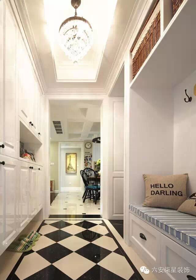 ▲ 进门玄关,菱形黑白铺贴的地砖,左侧是一整排鞋柜,底下空出一段可以方便放常用鞋,中间镂空一段可以放钥匙之类的