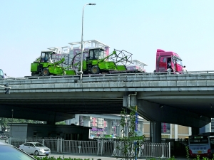 原标题:水泥罐车追尾平板拖车 昨天中午,在大郊亭桥上,两辆收割机重新装上平板拖车准备运离,部分车体发生变形。汪慧贤/摄