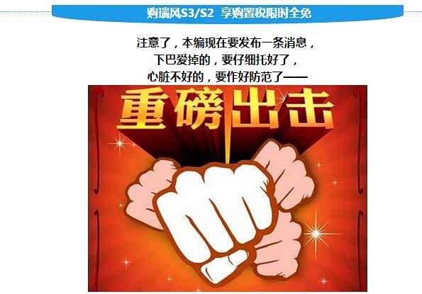 2016年12月5日至12月31日, 来六安恒天购瑞风S3/S2, 享购置税限时全免 ! 注意! 不是减半,是全免!全免! 但是 购置税全免算什么 来六安恒天购车 购置税全免 送保险 送装潢大礼包 是不是被这条重磅消息砸晕了? 本编现在也有点晕。 昨天还提醒大家购置税减半倒计时了, 想买车的抓紧了, 今天就又收到这样一条更劲爆的消息。 减半的时候你犹豫, 现在全免了, 你总该下定决心了吧? 限时限量 再不出手就真的“税”不着了!!! 购置税全免!购置税全免!购置税全免! 送保险!送保险!送保险! 送装潢大礼包! (重要的事情说三遍)