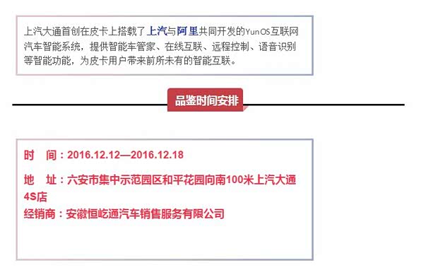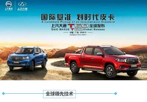 11月18日,国际基准 划时代的大通皮卡T 60,震撼上市.T60皮卡集全球领先技术、国际五星安全、卓越驾乘体验、丰富个性定制、无限智能互联于一身,为消费者带来全新的皮卡新体验!