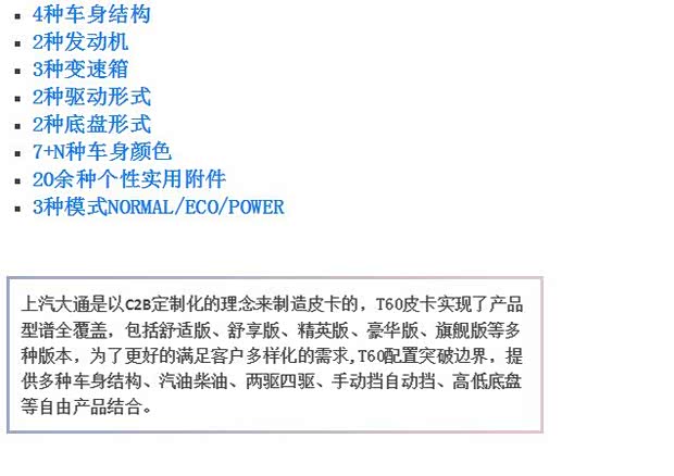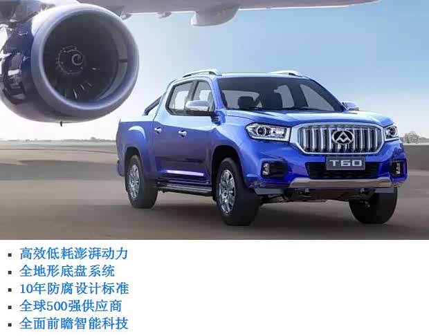 发动机——上汽大通T 60搭载源自欧洲的VM柴油发动机,采用VGT可变截面涡轮增压技术、BOSCH第三代高压共轨缸内直喷技术,最大功率110KW,峰值扭矩360Nm,综合油耗百公里仅为7.5L,可达欧6排放标准,并首创开发了Normal/Eco/Power三模驾驶,可根据高速公路、复杂路况等不同路况调节模式,以及首次正向开发了全渐变式后簧,实现舒适和操控的完美结合。